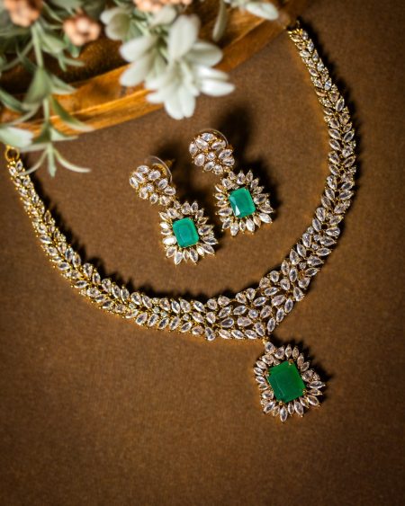 Nauheed is a stunning jewelry piece, showcasing an intricate setting of marquise diamonds that radiate elegance and sophistication. The necklace’s allure is heightened by its beautiful copper tone finish, accentuating the intricate details. The centerpiece pendant, adorned with an emerald green stone, adds a touch of luxury and opulence. Complete with a pair of matching green Diamond drop earrings, Nauheed is the epitome of refined beauty and timeless charm.