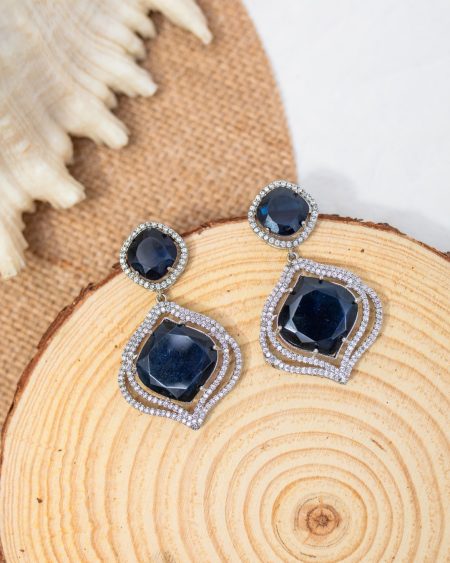 Radiating elegance and opulence, our Sapphire Blue Roshan Choker is a true showstopper. Crafted with a couture-like lattice design of deep blue stones framed in dazzling zircon brilliance, it’s a versatile piece that effortlessly transitions from regal soirées to modern-day celebrations. The structured silhouette gives the feel of a custom high-jewellery creation—yet it’s made with premium materials and available at a remarkably affordable rate. The necklace is accompanied by a pair of sapphire blue stone jhumkis that adds to the versatility of the piece as one can choose to create a traditional look by adding the jhumkis or simply wear the necklace on its own for a more contemporary styling.