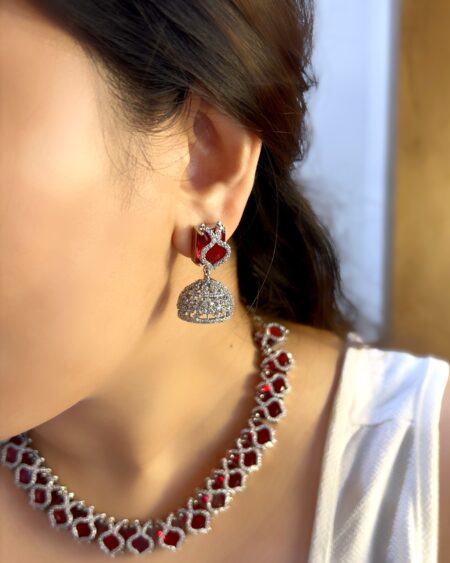 Radiating opulence and power, our Ruby Red Roshan Choker is a true showstopper. Crafted with a couture-like lattice design of deep blue stones framed in dazzling zircon brilliance, it’s a versatile piece that effortlessly transitions from regal soirées to modern-day celebrations. The structured silhouette gives the feel of a custom high-jewellery creation—yet it’s made with premium materials and available at a remarkably affordable rate. The necklace is accompanied by a pair of ruby red stone jhumkis that adds to the versatility of the piece as one can choose to create a traditional look by adding the jhumkis or simply wear the necklace on its own for a more contemporary styling.