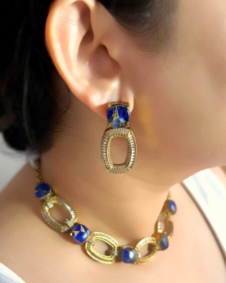 Turn heads with our Martina Link Necklace, a stunning blend of sapphire blue marble foil stones and gold-finished oval links encrusted with sparkling CZ diamonds. Designed for modern women who love statement jewellery, this bold choker adds instant luxury to both ethnic and western outfits—without breaking the bank. This luxurious necklace is accompanied by a pair of matching link-shaped earrings. Martina Necklace is perfect for festive looks, parties, cocktail events.