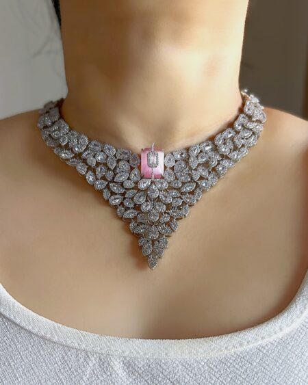 Step into the spotlight with our Samantha V-Curve CZ Choker, an ultra-glamorous creation for the bold and beautiful. This opulent statement necklace features a dramatic V-shaped silhouette, encrusted with brilliant-cut cubic zirconia leaves that cascade seamlessly into a dazzling centrepiece — a pink radiant-cut crystal crowned with a sparkling halo. Designed for brides, fashionistas, and connoisseurs of couture-inspired luxury, this neckpiece offers the brilliance of fine diamond jewellery with the accessibility of designer fashion. Its bold structure hugs the collarbone perfectly, making it a head-turning piece for weddings, luxury soirées, and high-profile events.