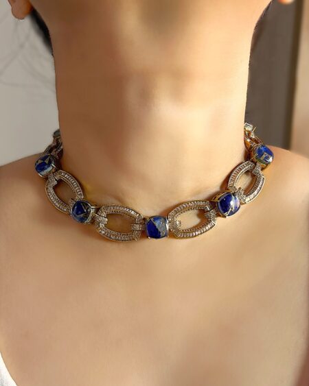 Turn heads with our Martina Link Necklace, a stunning blend of sapphire blue marble foil stones and gold-finished oval links encrusted with sparkling CZ diamonds. Designed for modern women who love statement jewellery, this bold choker adds instant luxury to both ethnic and western outfits—without breaking the bank. This luxurious necklace is accompanied by a pair of matching link-shaped earrings. Martina Necklace is perfect for festive looks, parties, cocktail events.