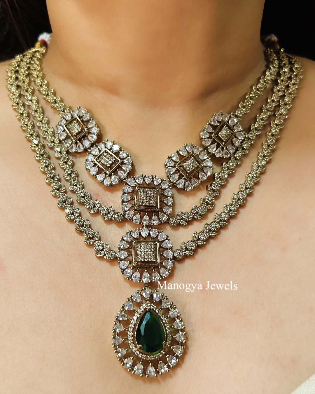 Introducing our stunning Samiksha Triple-Layered American Diamond Necklace, a masterpiece of elegance and craftsmanship. This luxurious piece features three intricately designed strands, embellished with sparkling white stones set in a floral-inspired pattern. The central motifs are square-shaped with exquisite detailing, leading down to a breathtaking teardrop pendant highlighted by a rich, emerald green stone. The victorian-finish necklace comes with a pair of matching statement earrings that mimic the design of the central pendant of the necklace. This necklace is perfect for women seeking to make a statement at weddings and festive events.