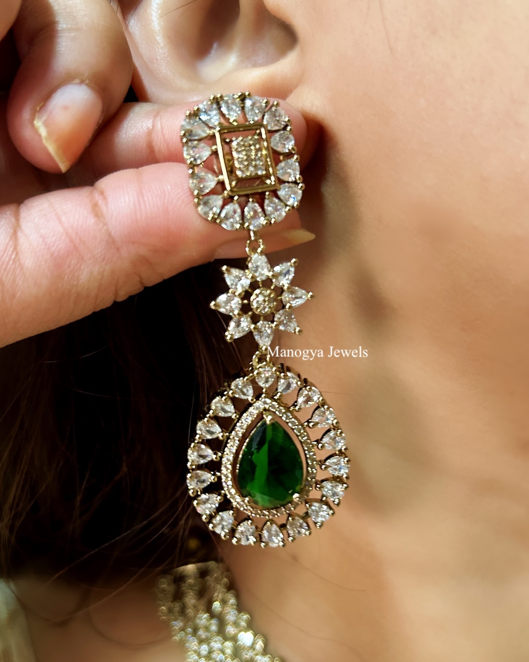 Experience the epitome of luxury and craftsmanship with our Minisha necklace. This exquisite piece showcases a brilliant diamond setting, meticulously crafted with emerald, marquise, and pear-shaped diamonds and stones. Luxurious diamond droplets along the length of the necklace enhance its allure, creating a breathtaking jewelry marvel. Complete with a stunning pair of long emerald green diamond earrings, the Minisha set exudes sophistication and elegance, perfect for making a statement at any occasion.