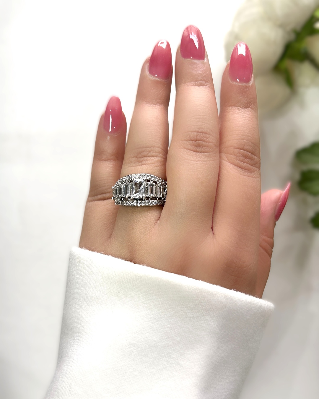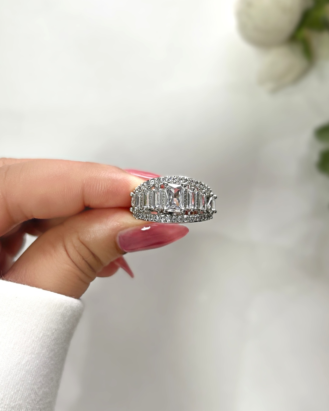 Sparkle without the splurge. Our Gloria Silver Statement Ring is a dazzling yet budget-friendly piece for fashion-forward women. Designed to mimic the elegance of fine diamond jewellery, this ring features a prominent square-cut solitaire at its center, accented with a shimmering halo and flanked by marquise-cut CZ stones on a bold triple-band setting. Crafted in a high-polish silver tone, the Gloria ring delivers maximum sparkle with minimum spend — perfect for parties, weddings, formal evenings, or simply elevating your everyday look. This budget-friendly stunner gives designer vibes without the designer price tag.