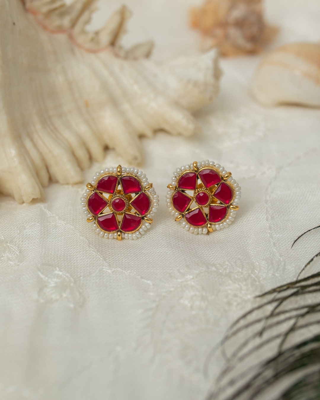 Our Manohari earrings are little bundle of beauty that can effortlessly elevate your daily look. These earrings feature pink stone-studded floral motif outlined by tiny pearls that add a touch of glam and sophistication.
