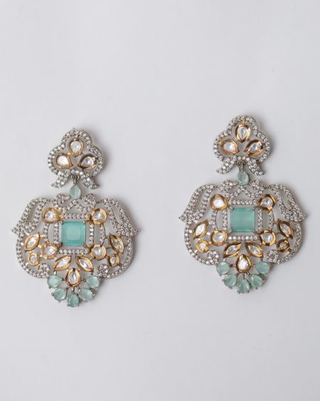 Our Pehel polki diamond earrings are a perfect example of luxury and elegance, featuring intricate design, accentuated by American diamonds and polki stones. Mint blue stones add a splash of colour, making the design more resplendent!