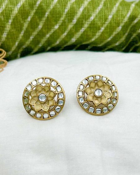 Tamira earrings are an epitome of elegance, featuring a blend of timeless kundan and classy beige hues. The stud earring features a floral motif in the center, surrounded by kundans on the rim of the circular stud. It could be worn with both traditional and formal outfits.