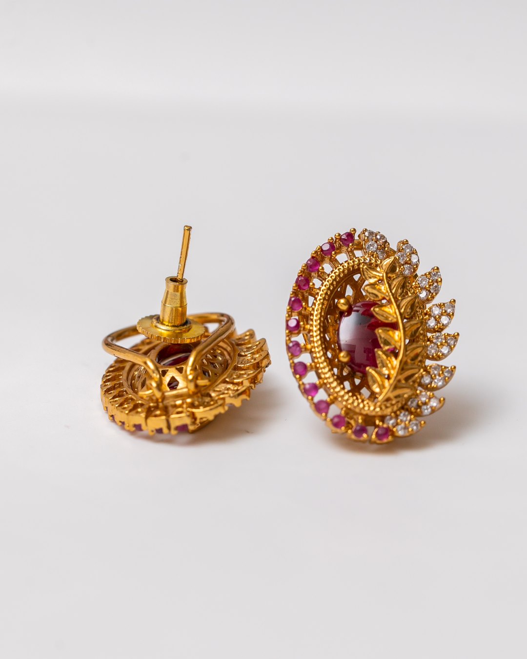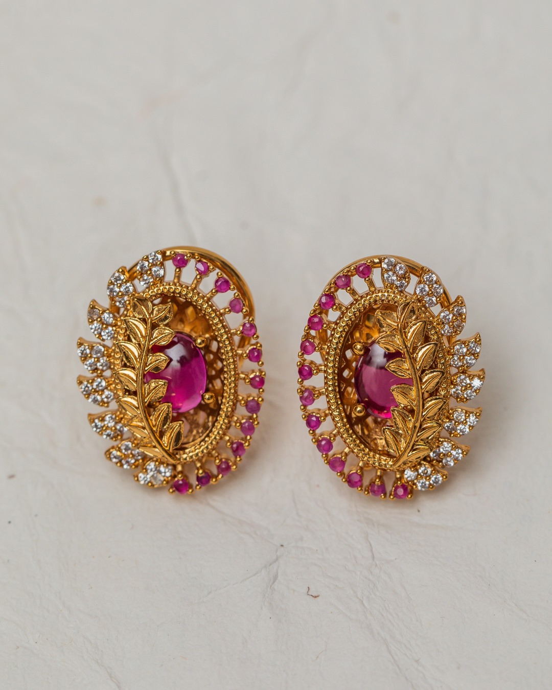 Our Bela earrings boast a timeless design with its enchanting oval silhouette, outlined by magenta stones on one side and a beautiful diamond-studded leaf-like pattern on the other. A delicate gold leaf passes through the centre of the earring, underneath which the artisans have placed a beautiful magenta kemp stone. The earring features a post back closure with additional support of a clip that helps to keep the earring in position firmly, showcasing every little detail of this magnificent stud earring.
