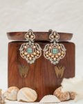 Our Kimaya earrings are magical, as their name suggests. These magnanimous three-tiered earrings feature a diamond-set stud at the top with a circular mid ring that is set with gorgeous crystal lattice work surrounded by beautiful diamonds and is bordered with pearls. That’s not it. This fabulous earring is complete with kundan-studded jhumka and stone droplets.