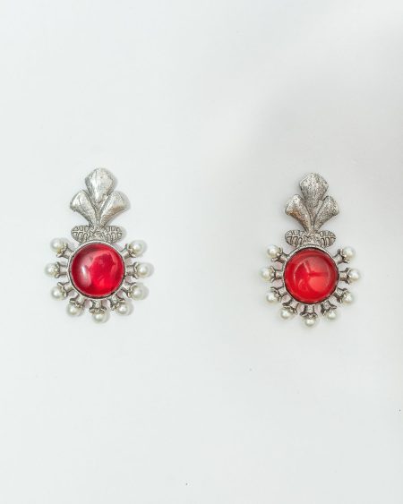 Our Palak Earrings are tailored for the pro-minimalists who appreciate the beauty of traditional jewelry without compromising on simplicity. At the heart of the Palak Earrings is a red monalisa stone that sits delicately underneath a charming leaf design. The round Monalisa stone, like a luminescent gem, adds a touch of radiance to the earrings and is outlined by lustrous pearls, while the leaf design imparts a sense of organic beauty. The simplicity of the design ensures that these earrings can effortlessly become your favorite accessory with just one glance.