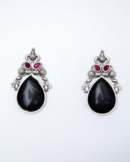 Introducing our Miray earrings, showcasing a timeless design adorned with vintage floral motifs at the top, accented by tiny lustrous magenta stones for added elegance. These silver-toned earrings feature a striking pear-shaped black stone drop, adding a touch of sophistication to any ensemble. With their classic yet captivating design, the Miray earrings are the perfect accessory to elevate your look with effortless style.