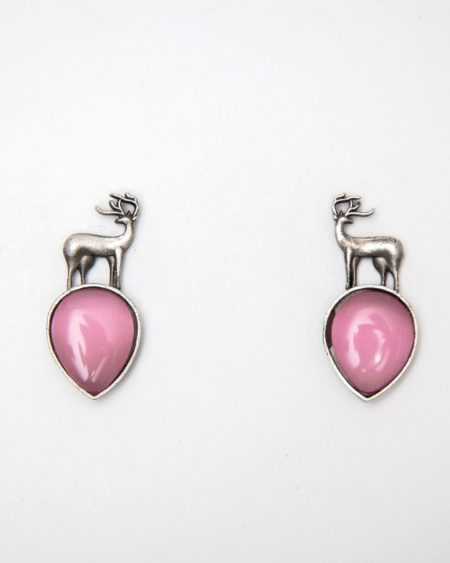 Introducing our Nitya studs, showcasing a majestic deer motif complemented by a delicate pink Monalisa stone drop. Crafted with a silver lookalike finish, these earrings are versatile and minimal, making them the perfect accessory to complement both traditional and fusion outfits. Elevate your style effortlessly with these elegant studs, adding a touch of sophistication to any ensemble.
