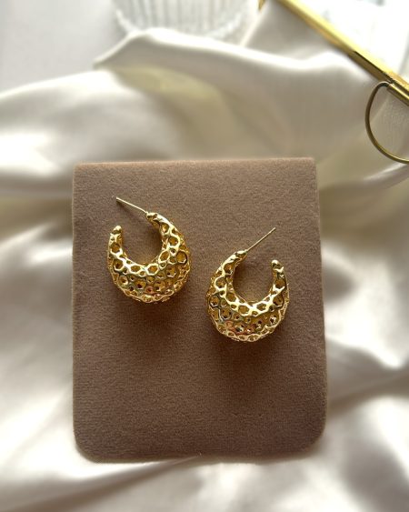 Add a celestial touch to your look with our statement Megan semi-hoop earrings crafted in a bold, honeycomb gold finish. With their unique molten texture and sculpted silhouette, these earrings channel the perfect balance of contemporary edge and artisanal allure. Crafted to stand out yet versatile enough for everyday luxury, they’re lightweight, anti-tarnish, and designed to shine with every movement — a bold pick for modern muses who like their accessories with a little attitude.
