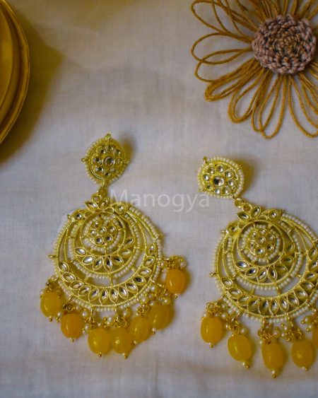 As your gaze descends, the lower portion of the earrings draws inspiration from the monumental gates of the Mughal forts. A captivating yellow monalisa stone takes pride of place in the center, radiating with regal allure. Surrounding this central gem are vibrant pink stones, creating a rich and harmonious tapestry of color. The intricate design is further enhanced by the presence of pearl droplets, delicately outlining the entire structure and adding a touch of ethereal charm.