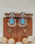 This dual-tone silver lookalike earring features a chakra-like stud embellished with stones while a Talwar-inspired bold motif with intricate pattern, outlined by pearls. These two components are merged together with a lustrous monalisa stone.