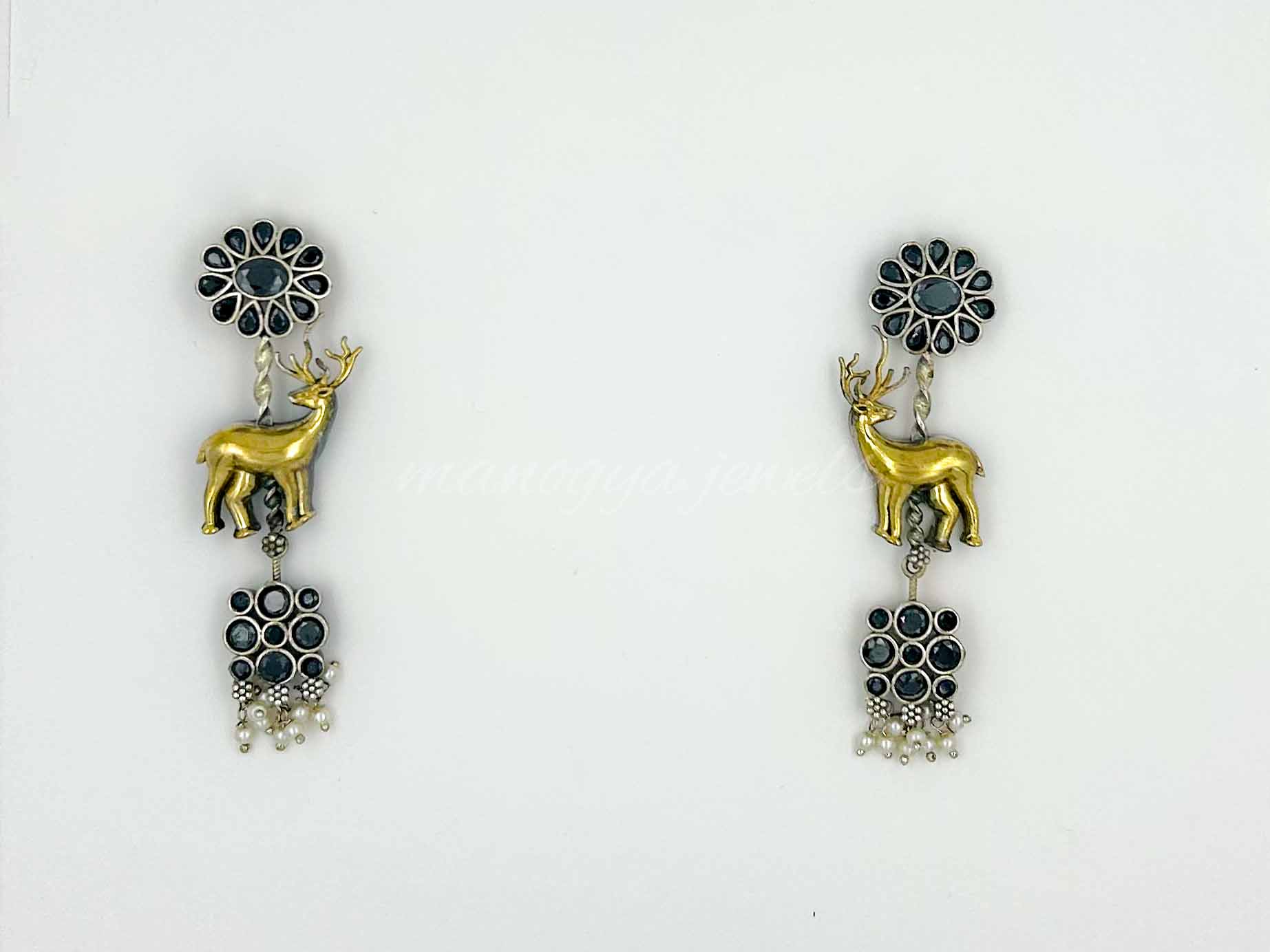 Crafted with the finest attention to detail, the Hirni earrings are a perfect blend of traditional design and modern elegance. The golden deer figurine is a symbol of grace and beauty, while the Jaipuri stone-studded flower motifs add a touch of color and vibrancy to the design. The intricate details of the design are a testament to the skilled craftsmanship that went into creating this exquisite piece of jewelry.