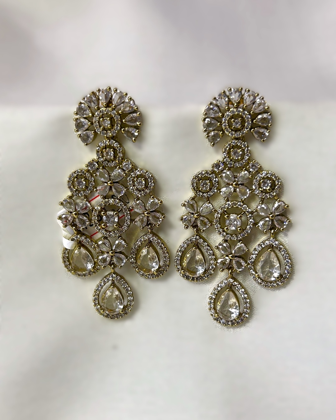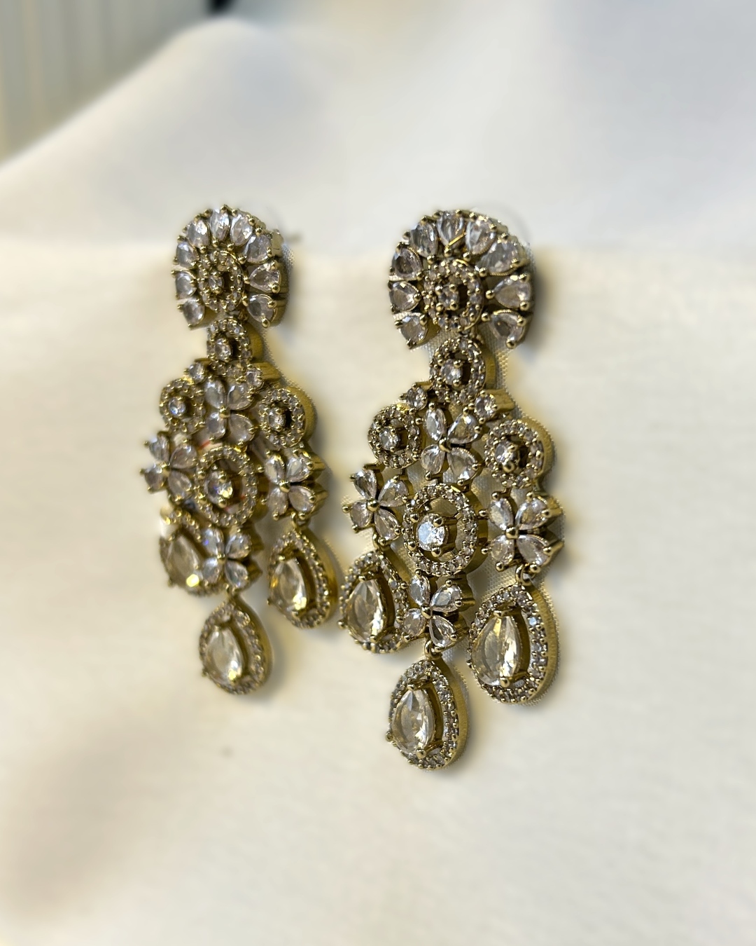 Elevate your glam game with our Jhelum AD Statement Earrings – a dazzling blend of vintage royalty and modern fashion. Adorned with clear white teardrop crystals, shimmering CZ stones, and floral detailing, these earrings are your go-to for weddings, parties, or that luxe evening out. The muted neutral tone makes these earrings a perfect pick for all your festive outfits.
