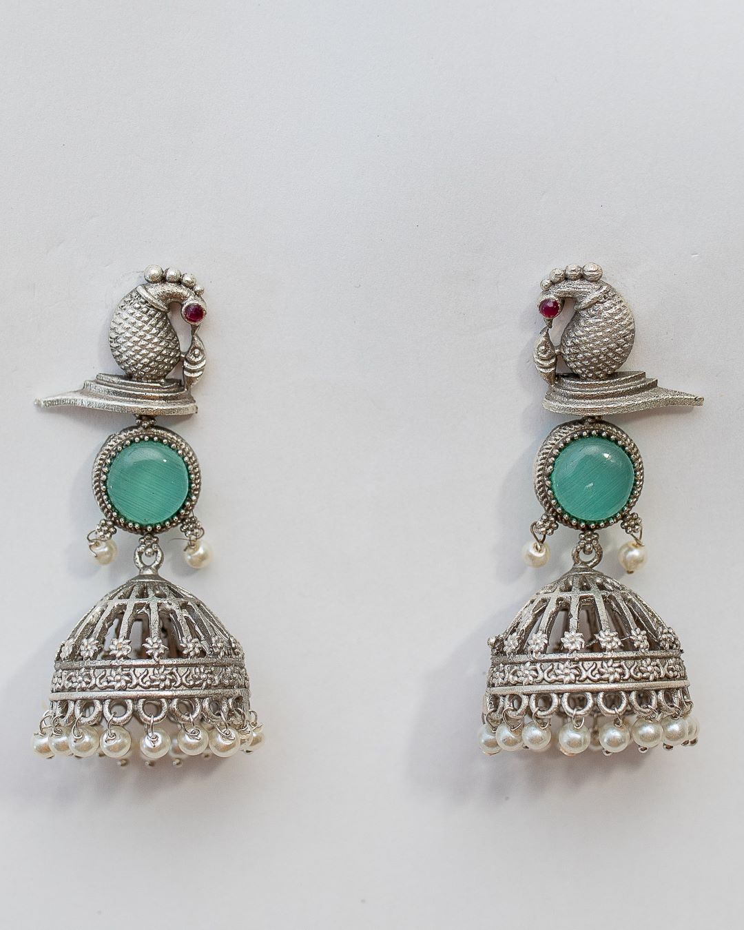 Our Jiyanshi earrings are perfect for all the jhumka lovers who are obsessed with adorning traditional indian style jewellery every day but want to keep it more subtle. At the heart of the Jiyanshi Earrings is a beautifully carved bird, perched gracefully at the top while a small jhumki dangles, bringing the quintessential essence of jhumkas to these earrings. A lustrous mint blue Monalisa stone, delicately placed between the top stud and the jhumki adds a dash of color to this resplendent creation.