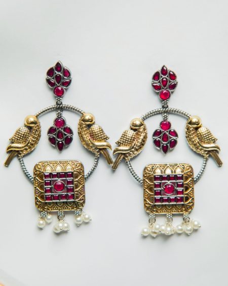 Our Nita chandbali is adorned with two beautiful peacock figurines on either side of a circular ring that forms the main body of this aesthetically rich chandbali. The ring culminates with a golden-hued square centrepiece that is studded with lustrous maroon stones and decorated with intricate patterns, inspired by traditional motifs often seen on the royal palaces of Rajasthan. These traditional Indian chandbalis source inspiration from rich Indian heritage and are a perfect accessory to be paired with Indian attires for a opulent and classy look.