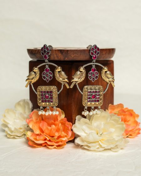 Our Nita chandbali is adorned with two beautiful peacock figurines on either side of a circular ring that forms the main body of this aesthetically rich chandbali. The ring culminates with a golden-hued square centrepiece that is studded with lustrous maroon stones and decorated with intricate patterns, inspired by traditional motifs often seen on the royal palaces of Rajasthan. These traditional Indian chandbalis source inspiration from rich Indian heritage and are a perfect accessory to be paired with Indian attires for a opulent and classy look.