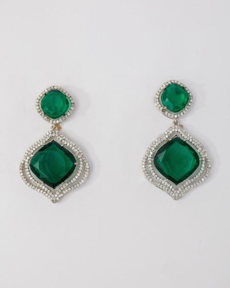 Leisha Earrings feature a resplendent green diamond stone that gracefully descends from a green stone stud at the top. The cushion cut green stones are embellished by a delicate contour of meticulously placed American diamonds. Elevate your style effortlessly and emanate confidence with these stunning tonal earrings.