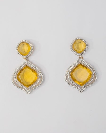 Leisha Earrings feature a resplendent yellow diamond stone that gracefully descends from a blue stone stud at the top. The cushion cut yellow stones are embellished by a delicate contour of meticulously placed American diamonds. Elevate your style effortlessly and emanate confidence with these stunning earrings.