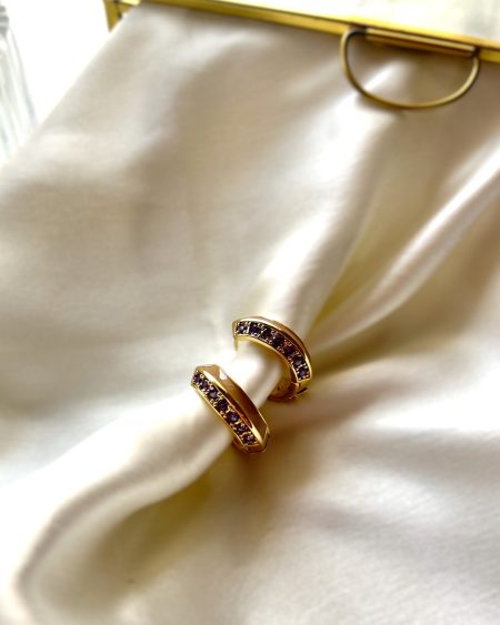 Crafted with precision, our anti-tarnish, hypoallergenic gold-plated Natalie hoop earrings are designed to deliver maximum style with zero compromise on comfort. Their unique geometric profile is embedded with a fine row of shimmering purple stones, making them an instant outfit-elevator for any occasion. Whether you’re brunching in the city or heading out for cocktails, these minimal-yet-luxe earrings bring a bold twist to classic hoop styles. Made for girls who crave premium fashion accessories that are as distinct as their personality.