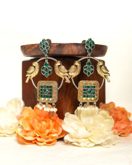 Our Nita chandbali is adorned with two beautiful peacock figurines on either side of a circular ring that forms the main body of this aesthetically rich chandbali. The ring culminates with a golden-hued square centrepiece that is studded with deep green stones and decorated with intricate patterns, inspired by traditional motifs often seen on the royal palaces of Rajasthan. These traditional Indian chandbalis source inspiration from rich Indian heritage and are a perfect accessory to be paired with Indian attires for a opulent and classy look.