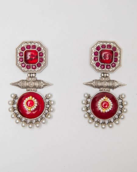 Our Hemanshi oxidised earrings are a testament to artistic Indian craftsmanship and designs, starting with the beautiful octagonal stud. This stud features a red stone at the center accented with fusion kundan and surrounded by tiny red stones. The stud connects to a unique design element reminiscent of tribal jewelry, which leads to a lovely circular droplet. The droplet showcases a large red stone at the center, encircled by a delicate border of pearls. Use of kundan elements creates a unique fusion making it a perfect accessory for that traditional elegance touch to any ensemble.