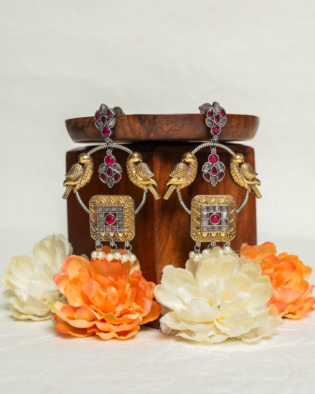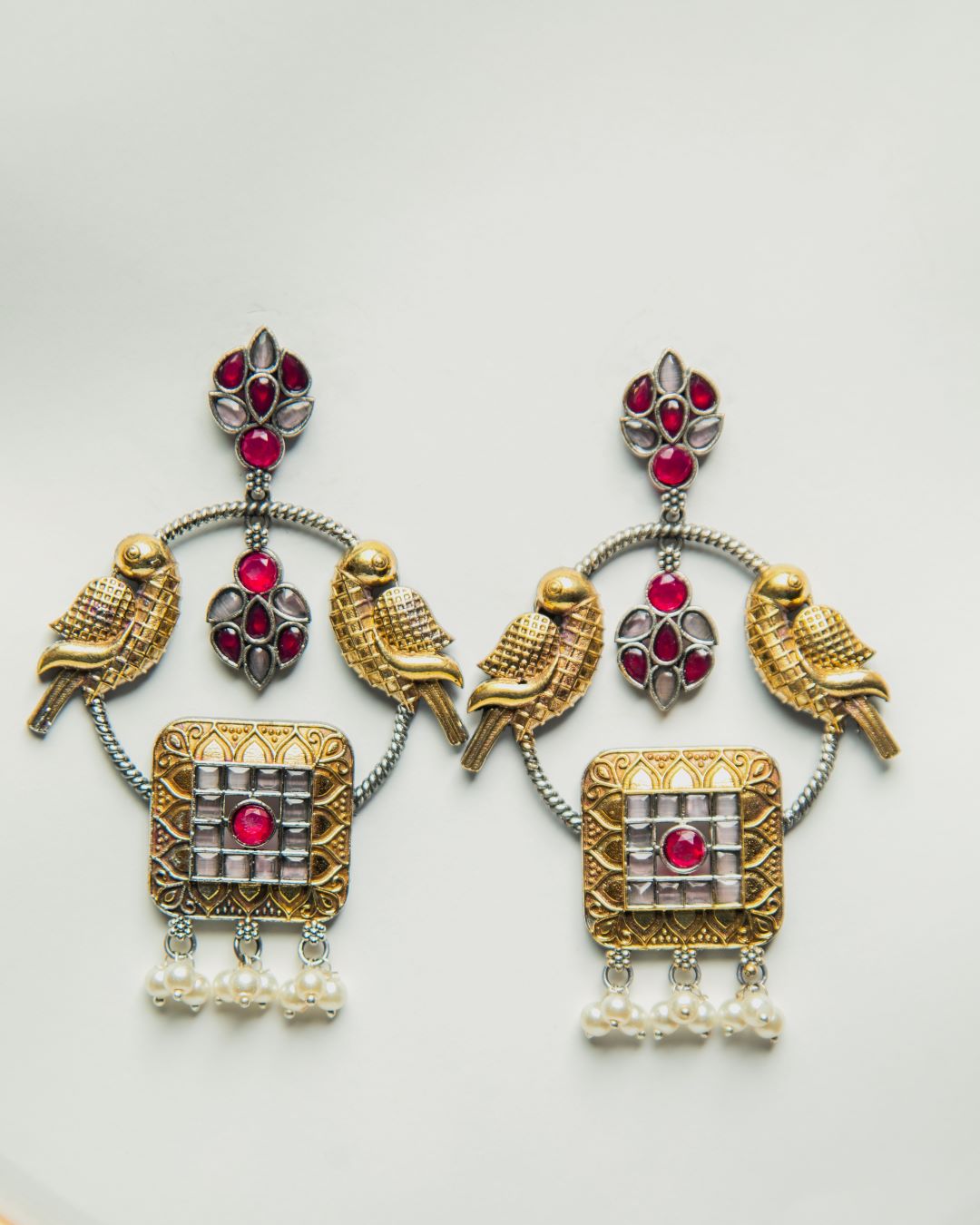 Dual-tone artisanal earrings decked up with intricately detailed motifs and maroon Jaipuri stones. For those who value craftsmanship, these earrings reflect the artistry of Indian artisans and their design sensibilities. It features a combination of Jaali jhumka, Indian matka-inspired motif and Indian paisley design with peacock figurines.