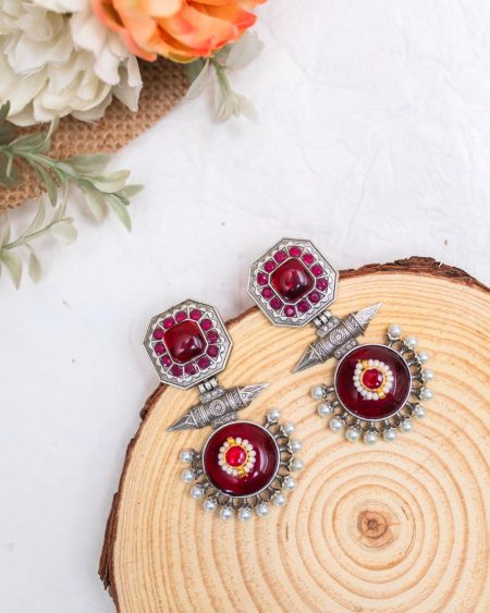Our Hemanshi oxidised earrings are a testament to artistic Indian craftsmanship and designs, starting with the beautiful octagonal stud. This stud features a red stone at the center accented with fusion kundan and surrounded by tiny red stones. The stud connects to a unique design element reminiscent of tribal jewelry, which leads to a lovely circular droplet. The droplet showcases a large red stone at the center, encircled by a delicate border of pearls. Use of kundan elements creates a unique fusion making it a perfect accessory for that traditional elegance touch to any ensemble.