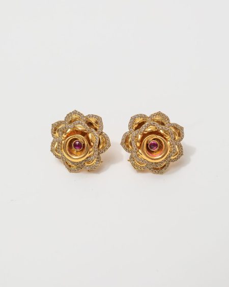 Introducing our Rosalia studs, exquisitely crafted with a majestic full bloom rose design, where each petal is delicately outlined by sparkling American diamonds. These earrings boast a clip-on closure in addition to the push-back closure, providing additional support and a secure fit. At the heart of this stunning design lies a lustrous kemp stone, adding a touch of elegance and sophistication to every ensemble.