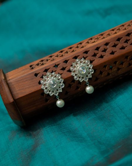 This dual-tone silver lookalike earring features a chakra-like stud embellished with stones while a Talwar-inspired bold motif with intricate pattern, outlined by pearls. These two components are merged together with a lustrous monalisa stone.