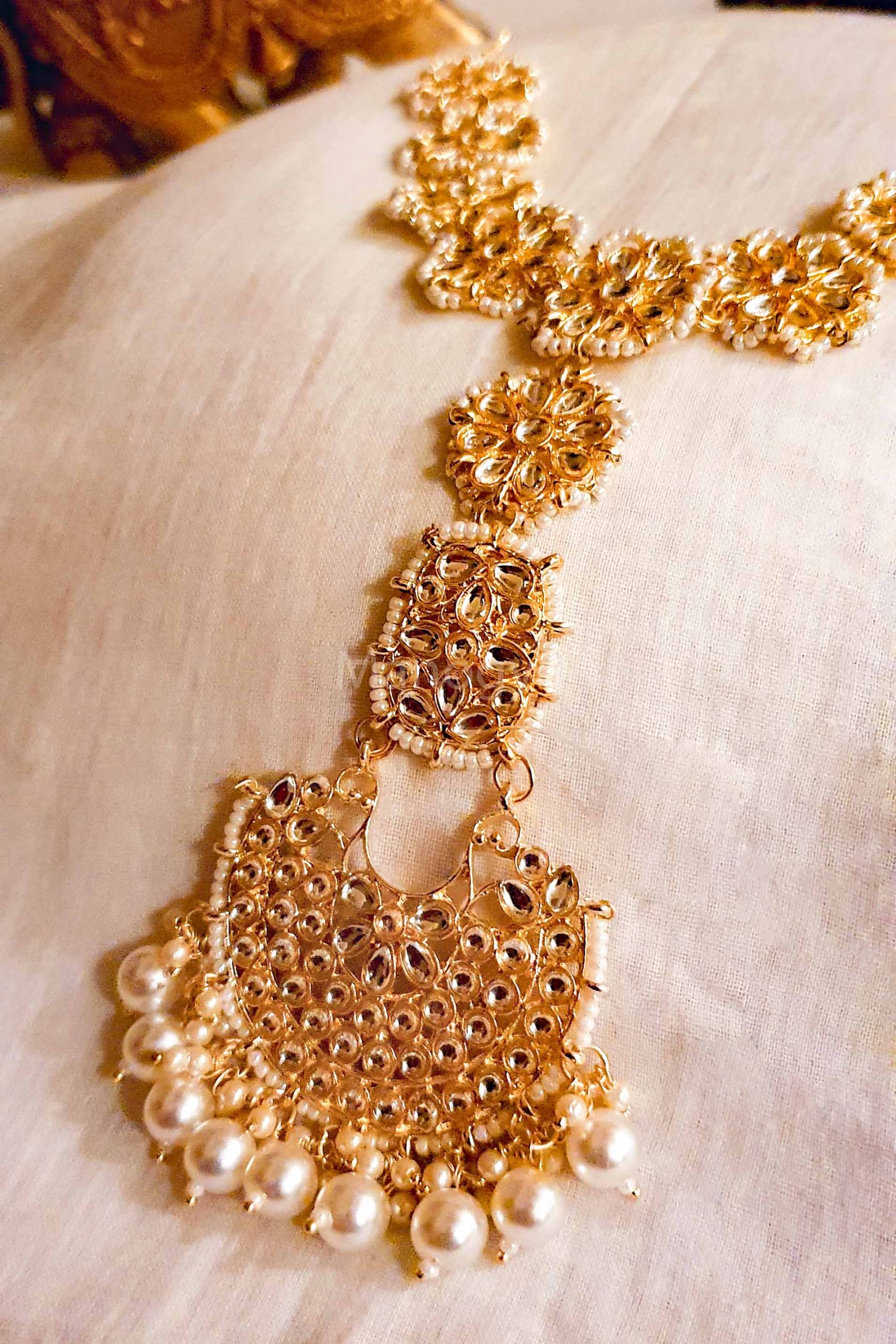 This awe-inspiring mathapatti features three stings of pearls that are adorned by golden-hued, kundan-studded flower motifs to grant a stately and regal look.