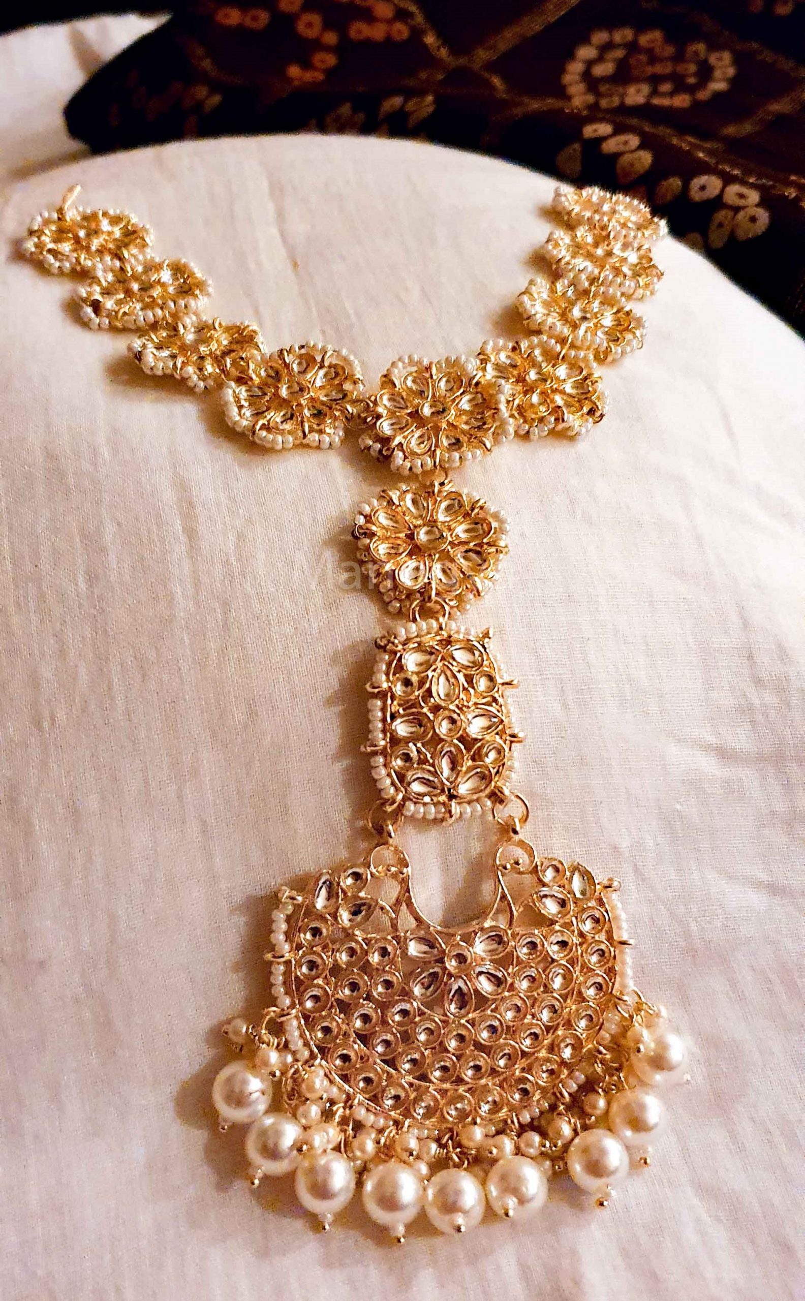 Mathapatti has been worn traditionally by women of several cultures across India but this piece of jewellery has found a new place in the hearts and jewellery collection of modern women in recent times. Our Atibha mathapatti features kundan-studded floral headband with a huge maang tika, all detailed with tiny white pearls.