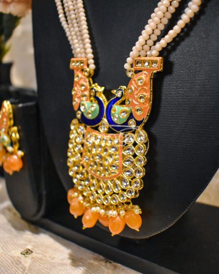 Held by multi-strand peach and white combination crystal strings is a huge kundan-studded pendant that boasts beautiful enamelled peacock motifs and peach glass beads. The peacock motifs are replicated again in the earrings, which are neatly adorned by kundan, glass beads and pearls, completing the entire look.