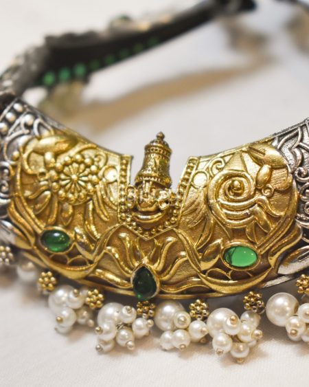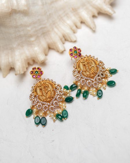 This exquisite temple jewelry necklace is a stunning piece featuring intricate craftsmanship and traditional design elements. The centerpiece of the necklace showcases beautifully carved Radha Krishna figurines, embodying the divine love and spirituality associated with the deities. The figures are surrounded by an ornate gold microplated framework that includes elaborate swirls and floral motifs, which are further embellished with sparkling stones. The necklace is adorned with vibrant green and ruby-red stones, adding a pop of color that contrasts elegantly with the rich gold tones. The lower edge of the necklace is accentuated with green teardrop beads and small pearl clusters, lending a luxurious and regal appearance to the piece. This necklace is ideal for traditional events, particularly South Indian weddings, and pairs beautifully with ethnic attire. It comes with a pair of equally beautiful and ornate earrings, featuring Radha Krishna figurines for a cohesive look.