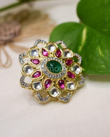 Our Aarzoo necklace is an opulent jewellery piece, featuring a central pendant with an interchangeable stone. The screw mechanism allows you to effortlessly swap out the center stone, with color options including vibrant green, clear white, mint blue, magenta, and blush pink. The accompanying earrings are designed to match, also featuring interchangeable center stones, allowing you to customize the set to suit any occasion. This necklace and earring set combines elegance with practicality, making it a must-have for those who love to switch up their style. It features victorian gold polish.