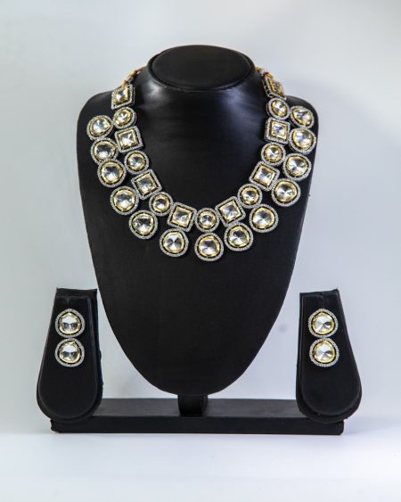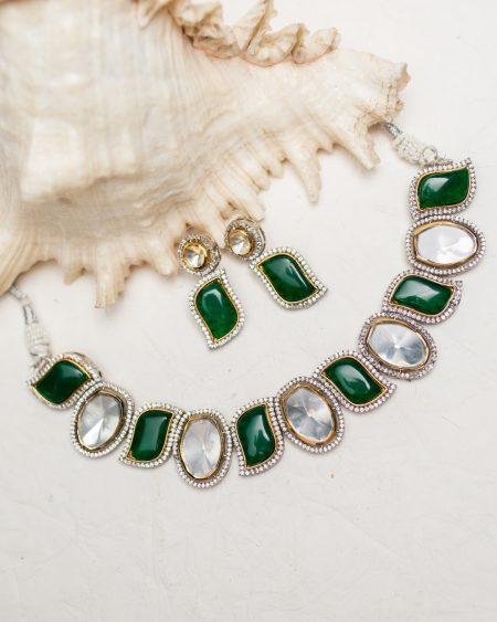 Simple yet gorgeous, our Saya polki necklace exudes elegance and royalty. It features a double layer of polki stones and comes with a pair of beautiful polki earrings. It’s a must-have for this wedding season.