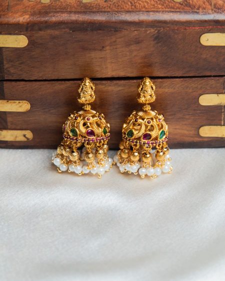 This stunning traditional temple necklace is a true masterpiece, featuring a central pendant adorned with intricately carved Goddess Laxmi and peacock motifs, surrounded by green kemp stones and delicate pearl drops. The necklace is paired with exquisitely carved jhumkis, showcasing fine craftsmanship with intricate motifs and vibrant embellishments. Perfect for special occasions, this set embodies the elegance and grandeur of traditional Indian jewellery, making it a must-have for any bridal trousseau or festive celebration.