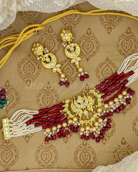 Our Red Kashish Necklace Set is expertly crafted with dabbi kundans and red glass beads and comes with delicate white pearl strings to elevate your ensemble with an opulent touch of sophistication and regality. There are very few neck pieces as elegant as this one. The necklace comes with matching earrings. Backside of the necklace pendant and earrings feature meenakari work. It’s definitely a must buy.