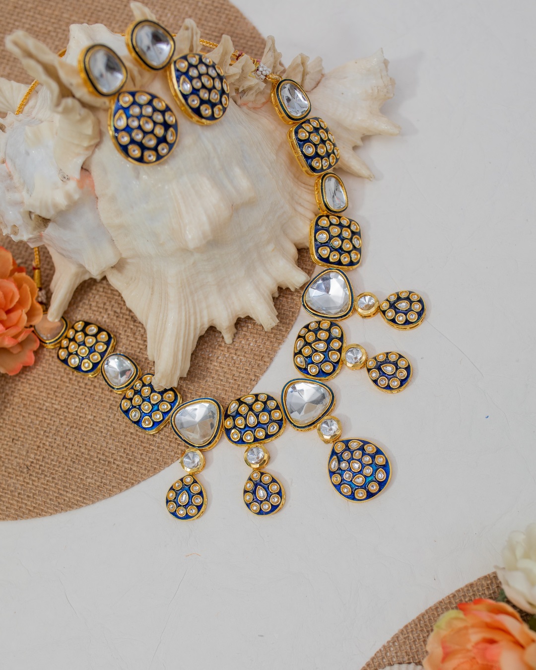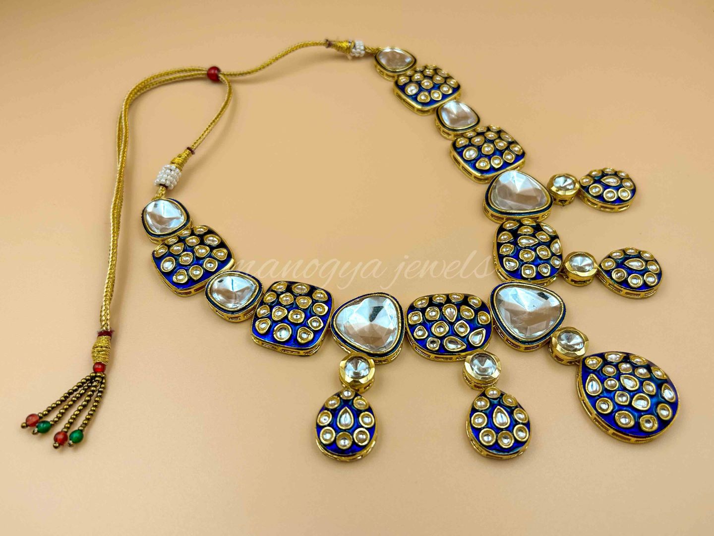 Indulge in the luxury and elegance of our Adhisha necklace set. A true masterpiece, this stunning necklace features a beautiful combination of kundan and blue enamelled pendants, adorned with elegant dabbi kundans that shimmer and shine with every movement.