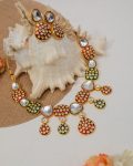 Our gorgeous Adhisha necklace set features a beautiful combination of kundan and green enamelled pendants with elegant dabbi kundans. It comes with a pair of matching earrings.