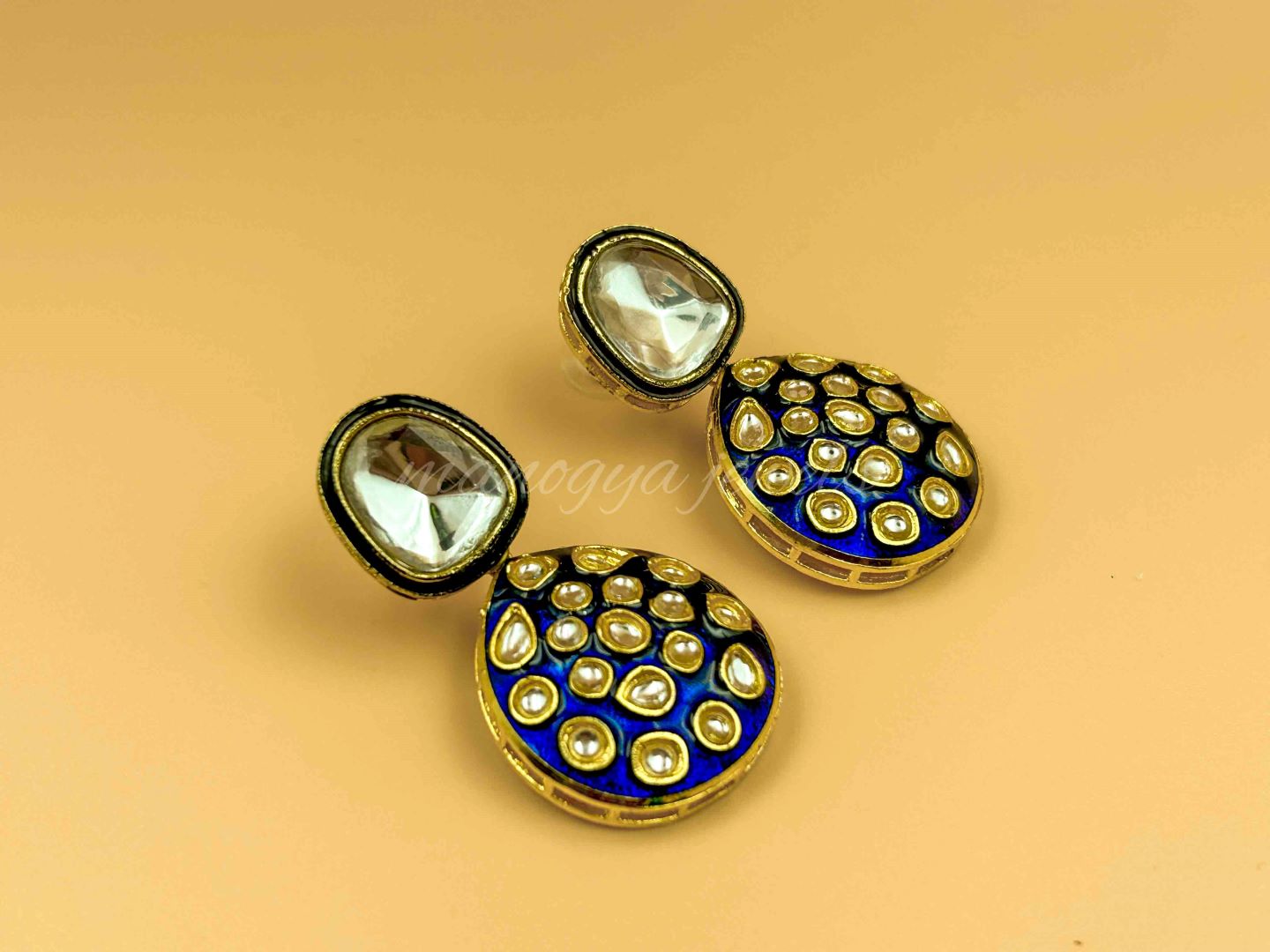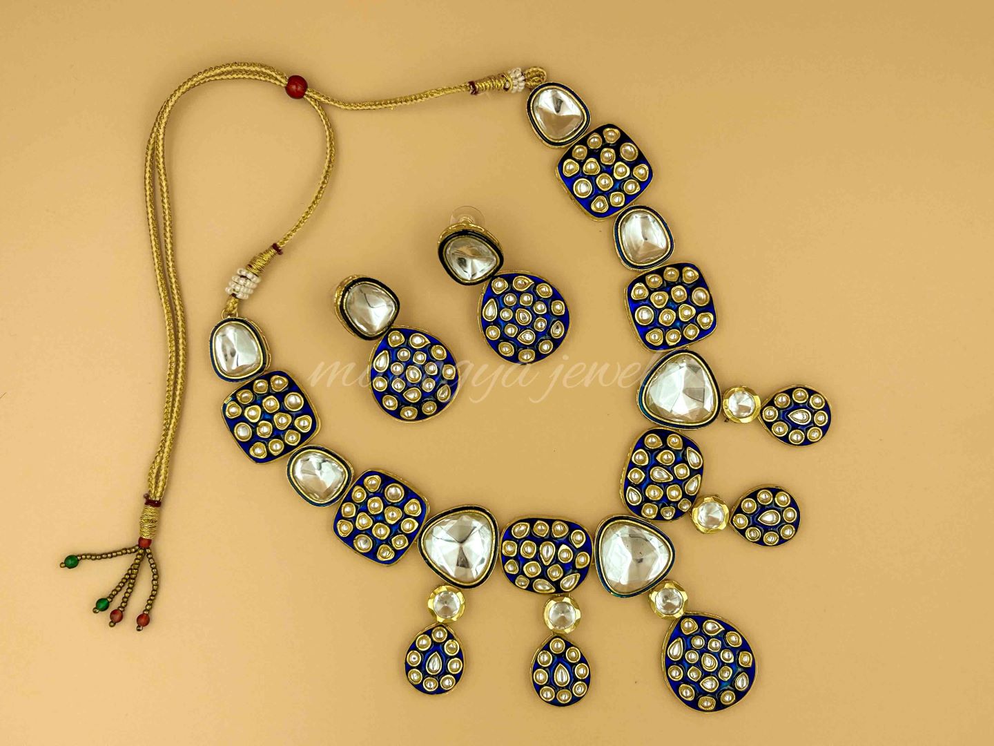 Something gorgeous you wished for is here. Our Adhisha necklace set features a beautiful combination of kundan and blue enamelled pendants with elegant dabbi kundans. It comes with a pair of matching earrings.