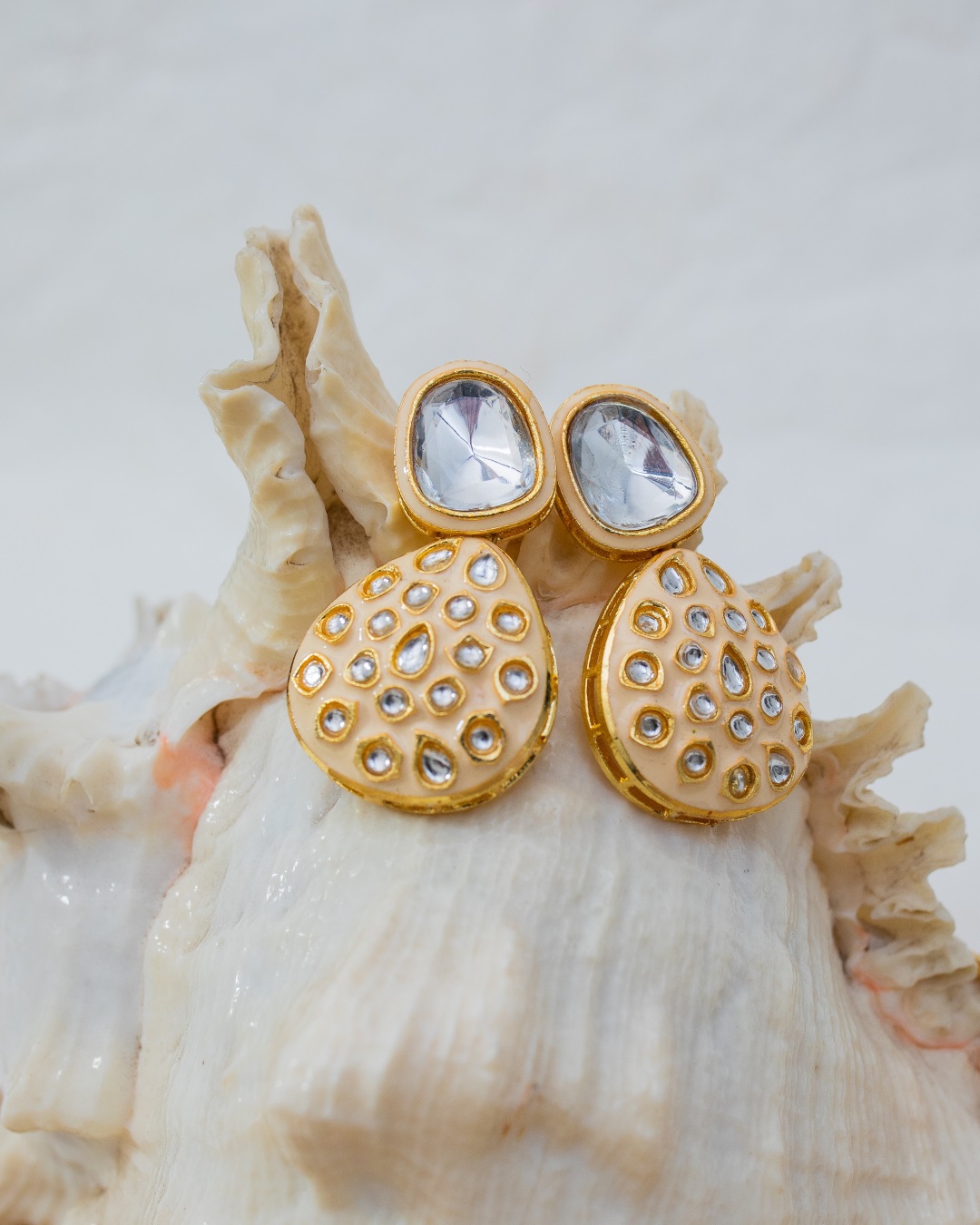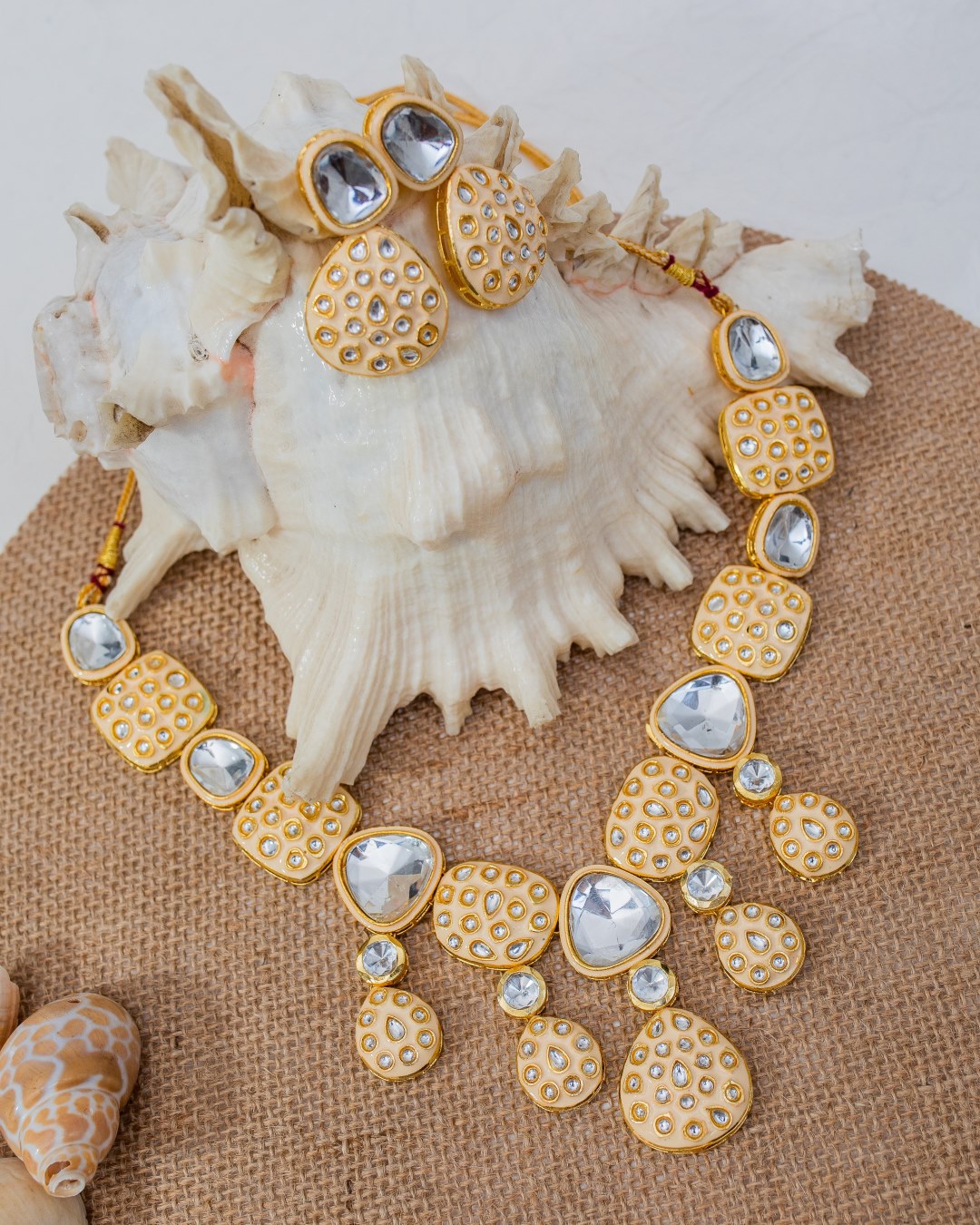 Something gorgeous you wished for is here. Our Adhisha necklace set features a beautiful combination of kundan and ivory enamelled pendants with elegant dabbi kundans. It comes with a pair of matching earrings.