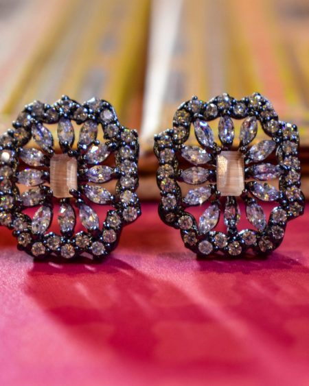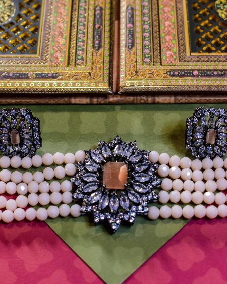 Often at crossroads whether to go all out and wear a dazzling heavy jewellery or go minimalist? Try our Kalpana necklace set that features an intricately designed oxidised pendant, studded with vibrant diamonds that encircle a peach stone. This exquisite pendant sits atop a cluster of five crystal bead strings, all coming together to make an elegant choker necklace. The neckpiece is complimented by a pair of vibrant diamond studs.