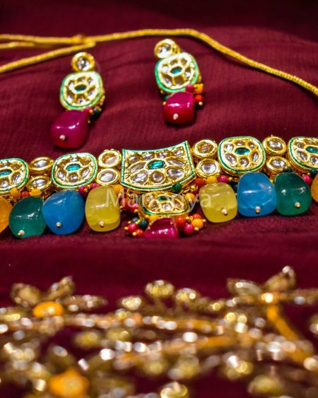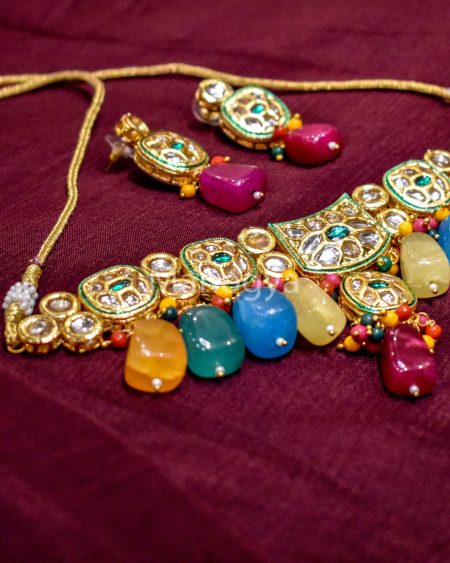 This premium necklace features a mix of kundan and vibrant natural stones in varied colours which uplift the look and feel of this exquisite necklace. Backside features a lovely meenakari design. It comes with earrings that mimic the necklace’s main design.