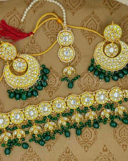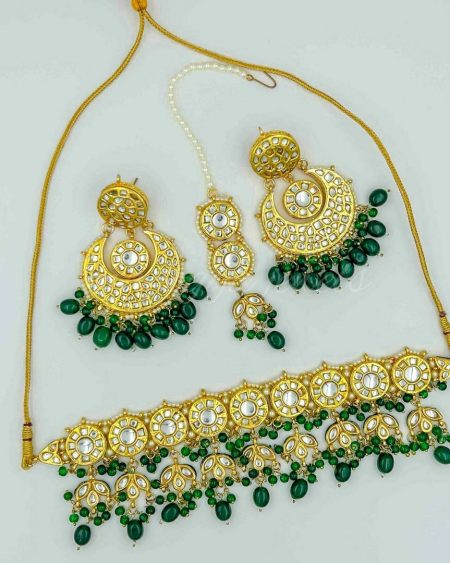 This drop-dead gorgeous necklace set features the traditional combination of golden hue and kundan and green glass beads. The set comes with a necklace, a pair of kundan chandbalis and a kundan teeka, and all of them feature meenakari work on the backside.