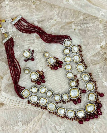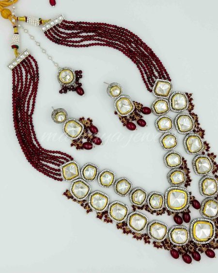 Our luxurious Katha necklace is designed with double layers of polki kundans with maroon glass bead droplets, all held together by maroon crystal strings . This long necklace exudes a regal look and is accompanied by matching polki earrings and a polki maang tika with a pearl string.